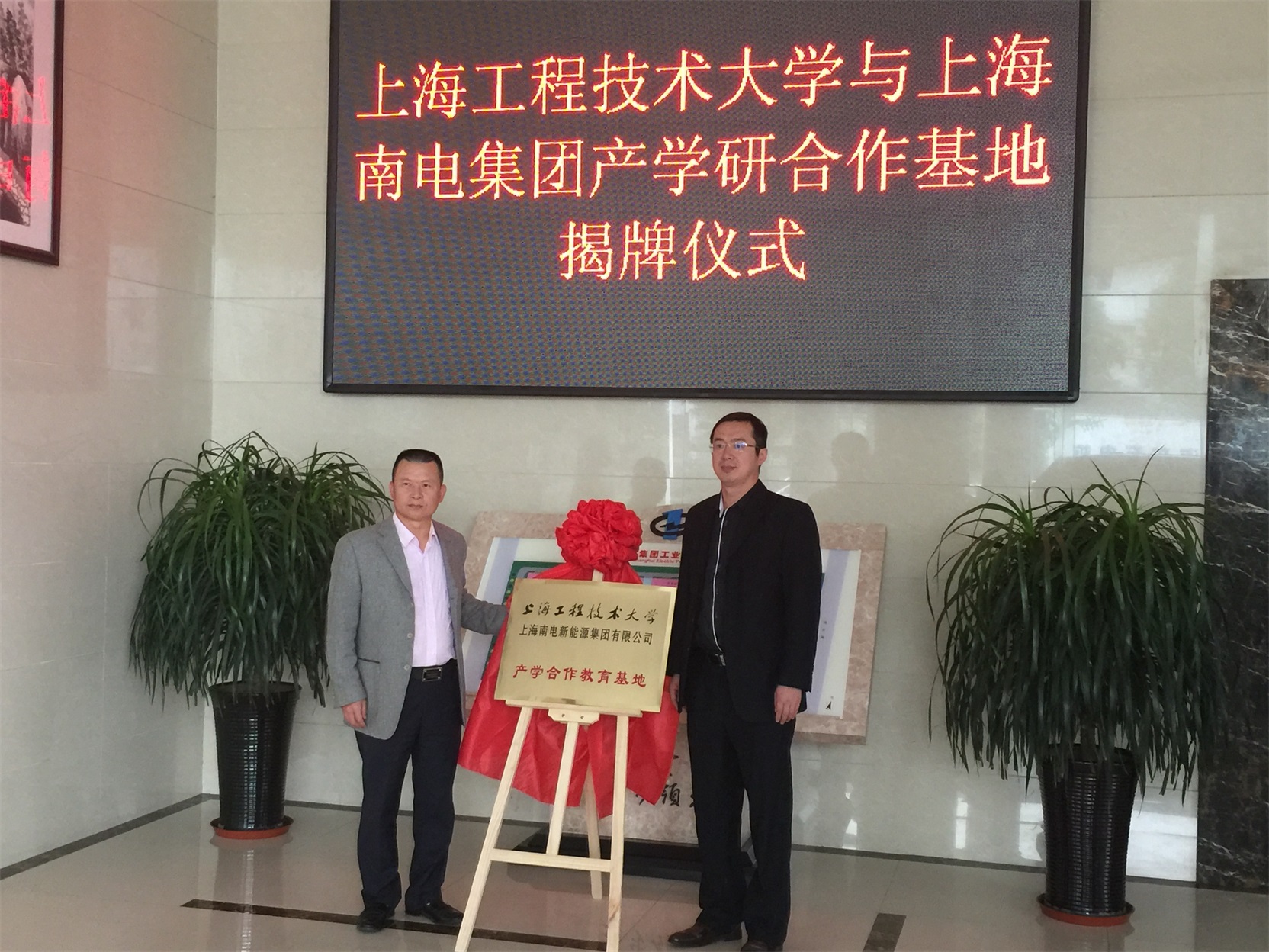 马建立与何大荣为“上海工程技术大学与上海南电集团产学合作基地”进行揭牌,至此汽车工程学院与上海南电集团的产学合作基地正式落成。