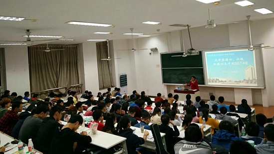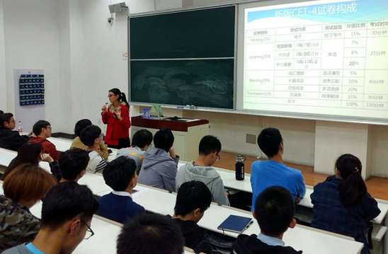 秋冬之交的校园已有丝丝寒意,但未能阻挡工程大学子积极向上的学习热情。11月1日晚,外国语学院大学英语口语教学团队在教学楼E215成功举办了大学英语四、六级口语讲座,现场座无虚席,气氛热烈。据教务处统计,11月我校口语考试考点开放的1500个四级口语考试机位早已经爆满,其中98%为本校考生。此次讲座旨在结合最新的四、六级考试大纲,解读考试要求和评分标准,