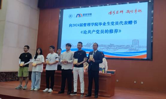 学院老师们向2024届管理学院毕业生党员代表赠送《论共产党员的修养》一书,希望同学们坚定理想信念,牢记初心使命,始终保持党员的先进性,毕业后不断在实践中学习和成长,成为新时代的奋斗者。