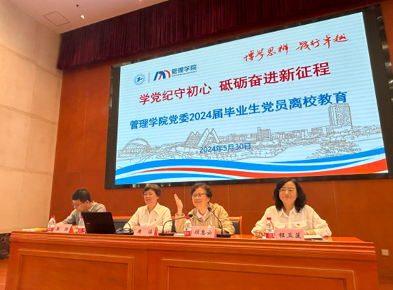 进一步强化毕业生党员的理想信念教育,遵纪守法、不触底线,让全体毕业生党员更深刻地认识到自身肩负的使命和责任,为毕业生党员踏上新征程、走好人生路、筑牢拒腐防变的思想防线上好“最后一课”。5月30日下午,管理学院党委在行政楼B301召开2024届毕业生党员离校教育。校关工委委员、管理学院关工委委员顾惠云;管理学院党委书记周洁,副书记程玉莲、张强,组织员徐佳、陆凤鸣以及2024届毕业生党员参加会议。会议由程玉莲同志主持。