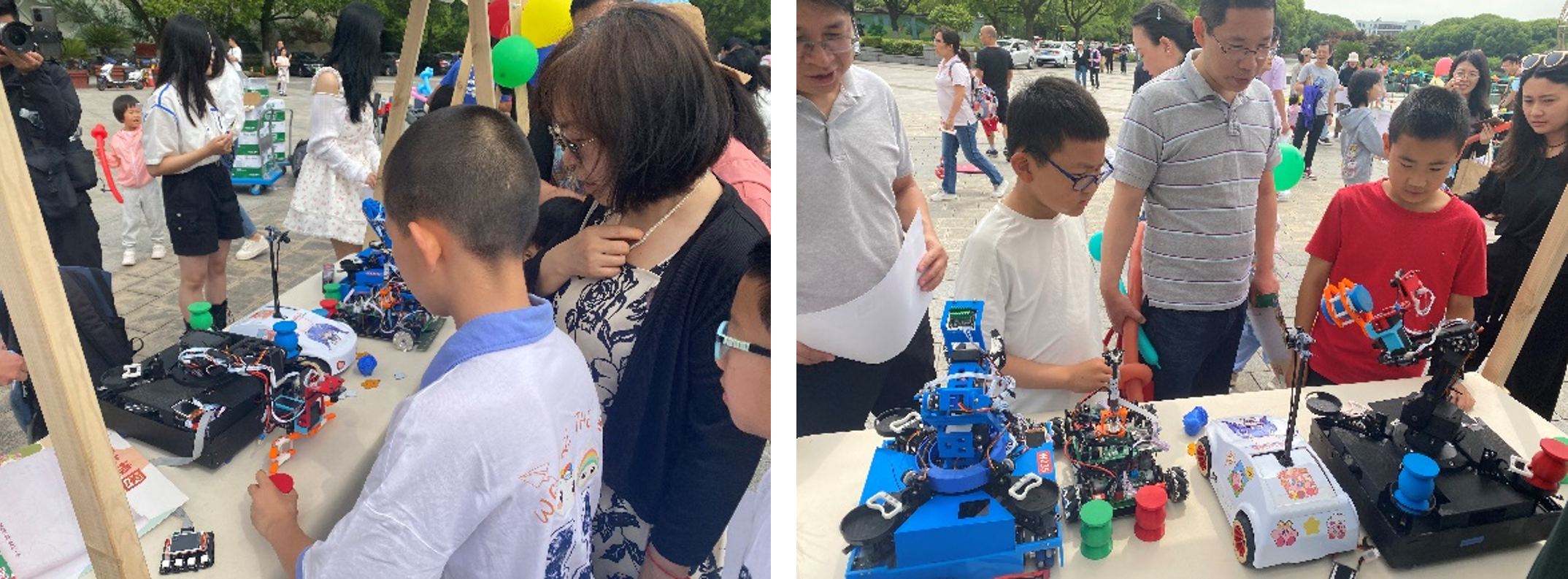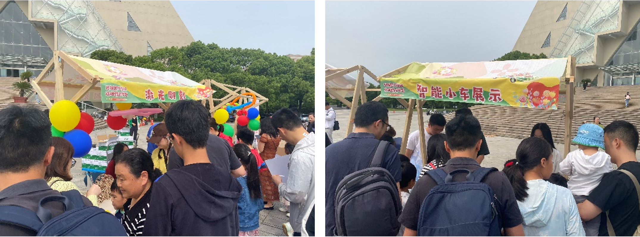 智能车车手们向小朋友们展示了机械臂抓物,并用身体构造类比智能小车的构成,把科技知识转换为孩子身边的事情,寓教于乐。