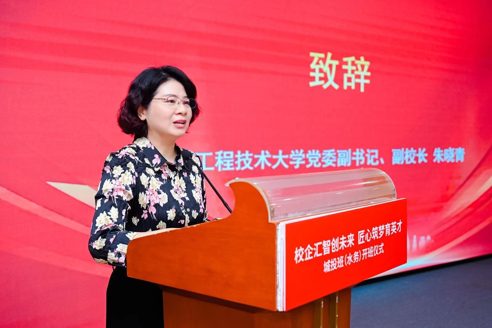 朱晓青在致辞中向上海城投集团和城投水务集团表示热烈的欢迎和衷心的感谢。指出城投(水务)班的创建既是校企双方积极贯彻党的二十大精神,深度落实产教融合的生动实践,又是学校“教育链”和企业“需求链”的精准对接,积极响应了习近平总书记“牢牢把握高质量发展这个首要任务,因地制宜发展新质生产力”的号召。她寄语学员们要以饱满的热情、严谨的态度投入到学习中去,用实际行动诠释新时代青年的担当与责任,为实现中国式现代化建设贡献自己的力量。