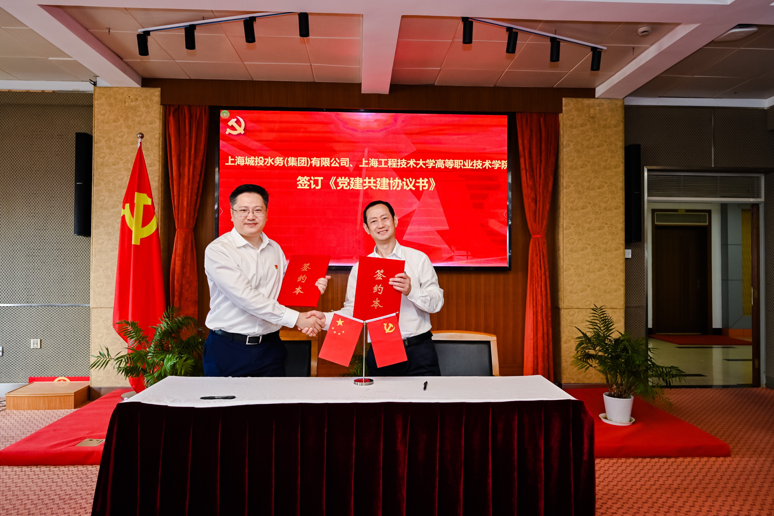 梁波、王振钧分别代表上海城投水务(集团)有限公司和上海工程技术大学高等职业技术学院郑重签署了《党建共建协议书》。