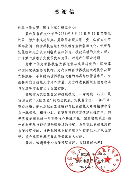 6月16日,中国墨子学会、滕州市墨子研究中心向世界技能大赛中国(上海)发来感谢信,感谢世赛研究中心在第六届鲁班文化节筹办期间,向世界技能组织积极推介宣传鲁班文化,使世界技能组织充分认识到鲁班匠心创造、技能革新的文化内涵。同时表示,要加强合作,共同推进我国职业技能培训和技能型人才队伍建设,提升我国世赛竞技水平。
