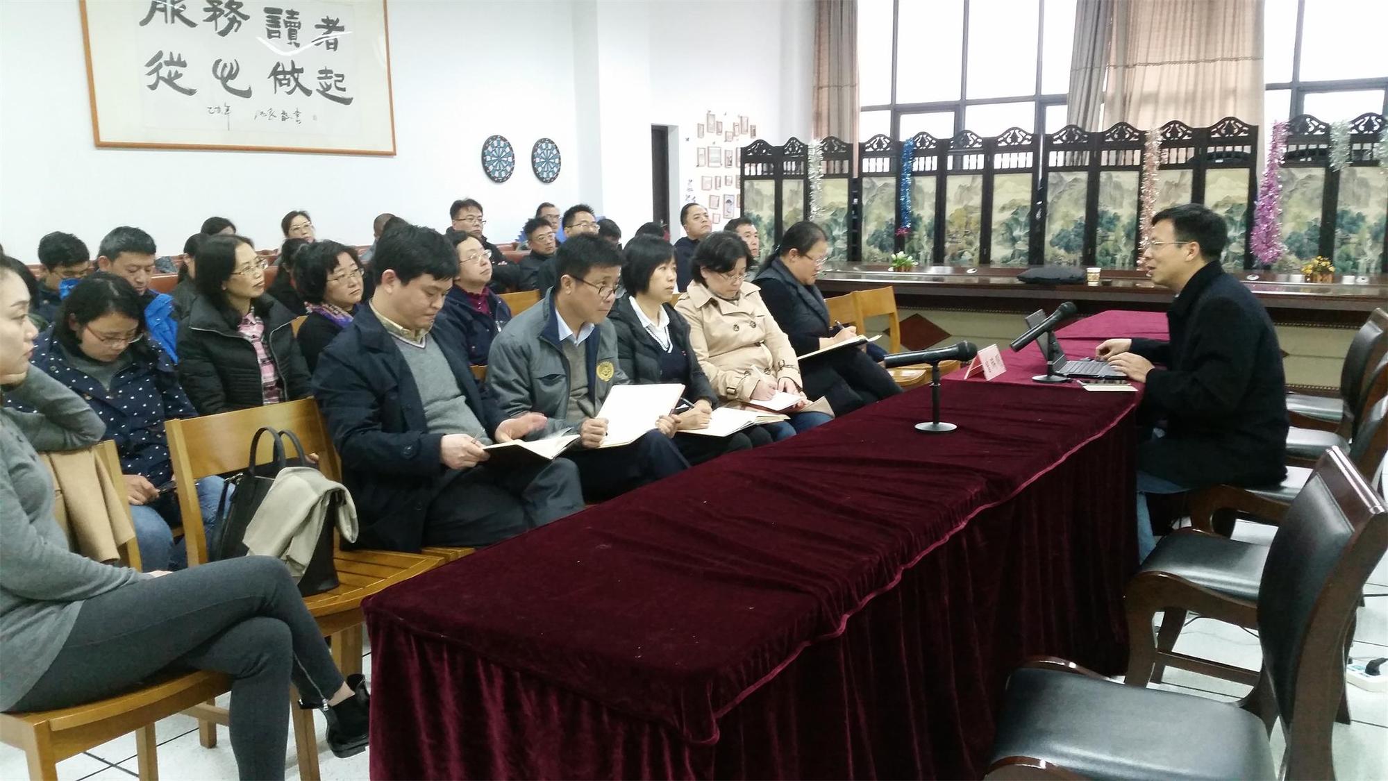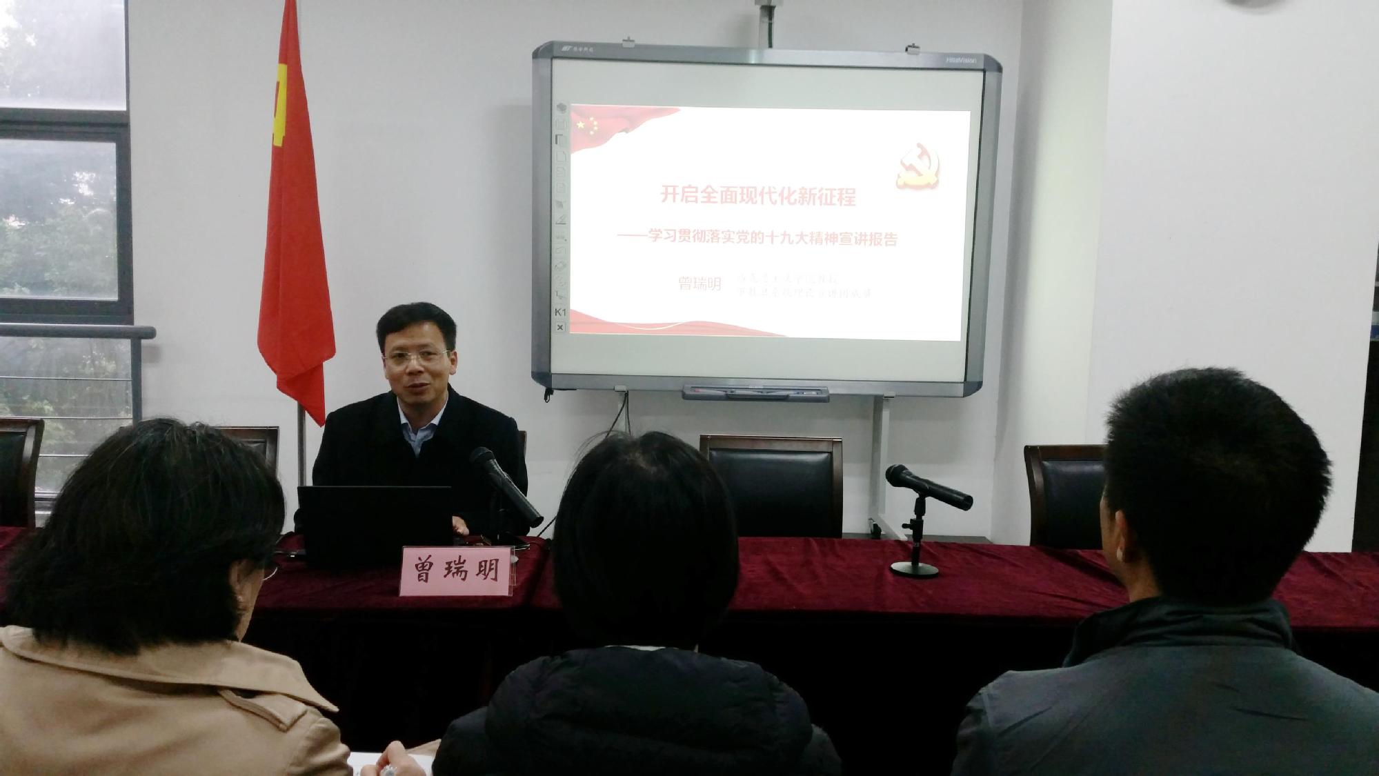 为更好地领会党的十九大精神实质,认真把握科学内涵, 11月29日,校党委讲师团成员、马克思主义学院曾瑞明教授为图书信息档案联合党总支和后勤实业发展中心党总支全体党员上了一堂题为“开启全面现代化新征程”的十九大精神宣讲报告。会议由图书信息档案联合党总支书记李军主持。
