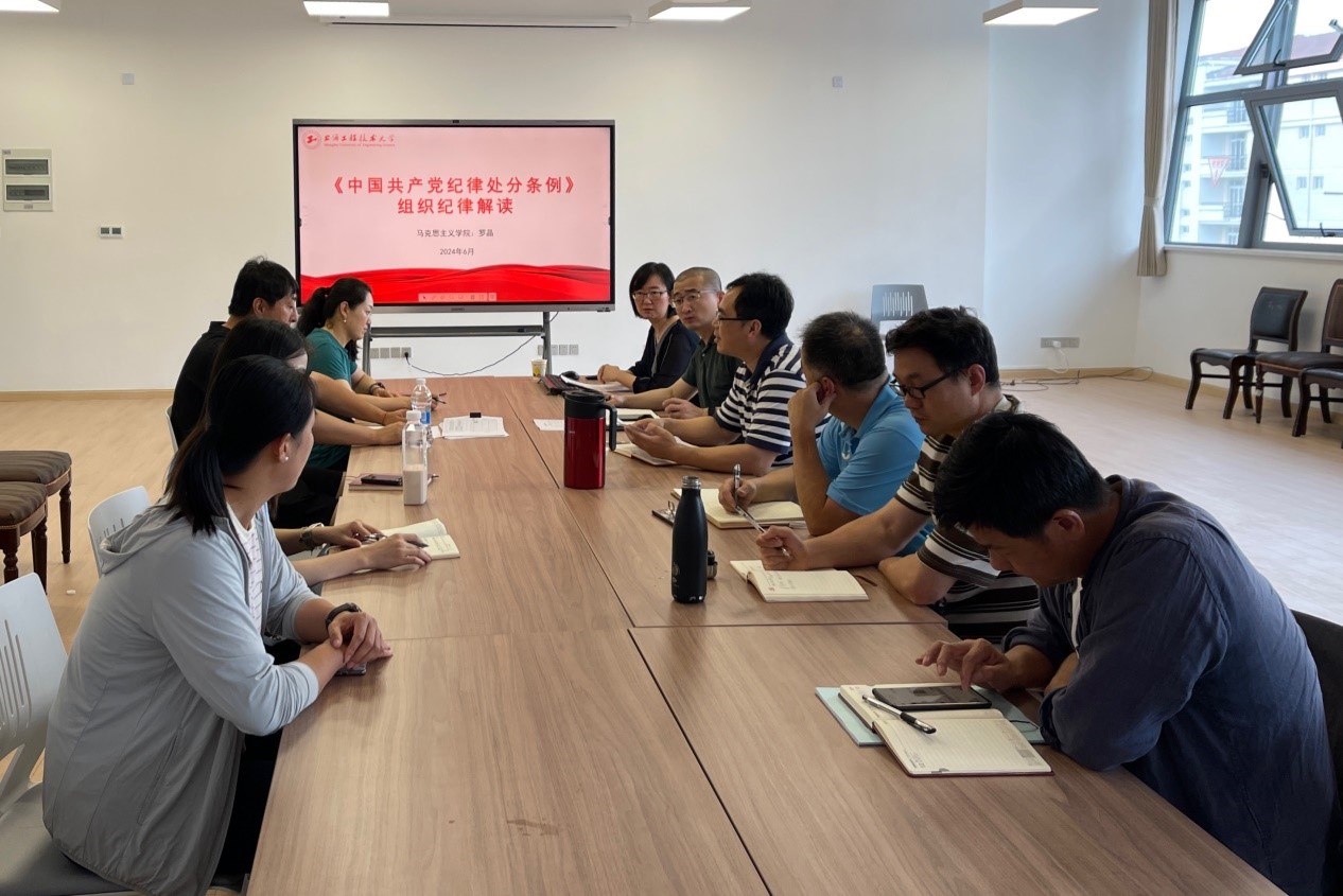 为深入学习贯彻习近平新时代中国特色社会主义思想,扎实开展党纪学习教育,切实提升党员干部能力素养。6月25日下午,体育教学部党总支举办科(职)级干部培训会,特邀马克思主义学院副教授罗晶老师就《中国共产党纪律处分条例》中的组织纪律进行了深入解读。体育教学部班子成员,全体科级干部、党支部书记、党支部委员参加培训,会议由党总支书记李扬主持。