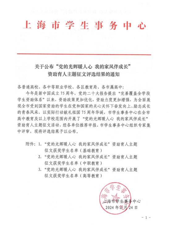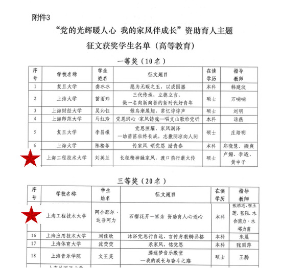 为全面展示受到国家资助的学生在党和国家的关心关怀下奋发向上、励志成长的青春风采,以实际行动献礼祖国75周年华诞。近日,由上海市学生事务中心举办的“党的光辉暖人心 我的家风伴成长”主题征文评选活动结果揭晓,我校机械与汽车工程学院刘英兰同学的作品《长征精神融家风渡口前行薪火传》荣获“一等奖”,管理学院阿合那尔·达吾阿力的作品《石榴花开一家亲 资助育人心连心》荣获“三等奖”。