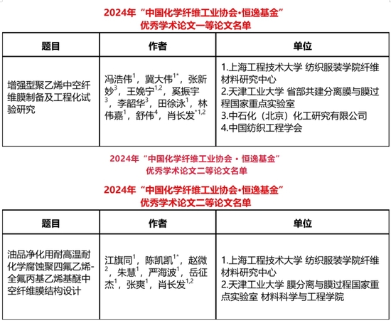 “中国化学纤维工业协会·恒逸基金优秀学术论文及软课题”是我国化纤及相关材料领域具有较高知名度、影响力的公益项目,2024年恒逸基金共收到有效参评论文264篇,内容覆盖先进纤维新材料、智能制造、企业管理及软课题等行业热点,最终评选出12篇一等论文、21篇二等论文。我校纺织服装学院纤维材料研究中心冀大伟副教授、肖长发教授指导研究生冯浩伟、田徐泳、林伟嘉等完成的论文《增强型聚乙烯中空纤维膜制备及工程化试验研究》获得一等奖(排序1),陈凯凯副教授、肖长发教授指导研究生江旗同、朱慧、严海波等完成的论文《油品净化用耐高温耐化学腐蚀聚四氟乙烯-全氟丙基乙烯基醚中空纤维膜结构设计》获得二等奖。