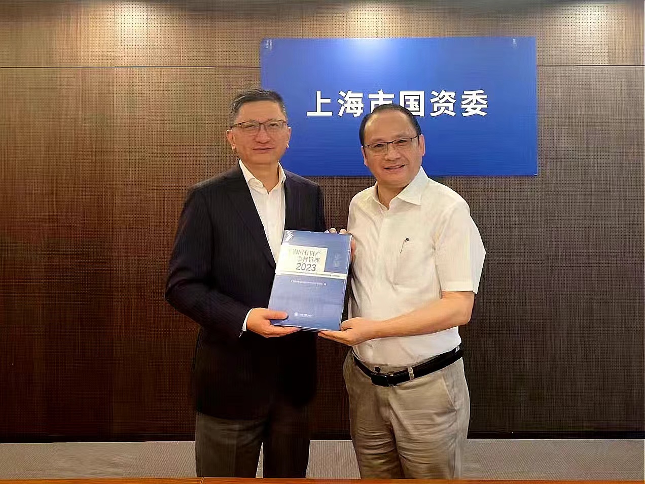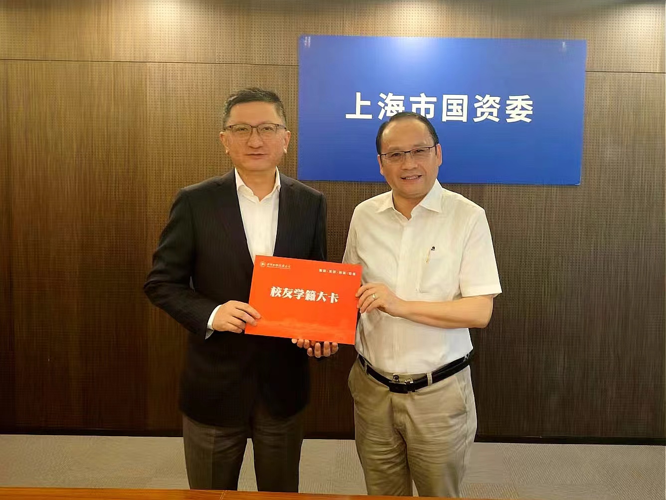 会谈后,俞涛校长向贺青校友赠送了他的毕业成绩登记表复刻纪念品,贺青校友向学校赠送了上海市国资委2023年年鉴。