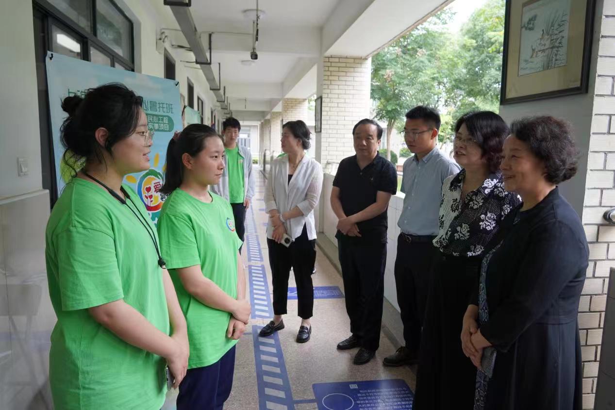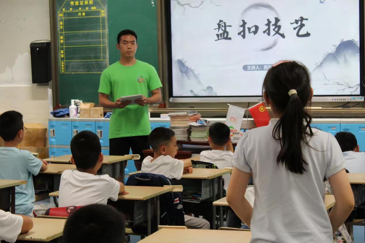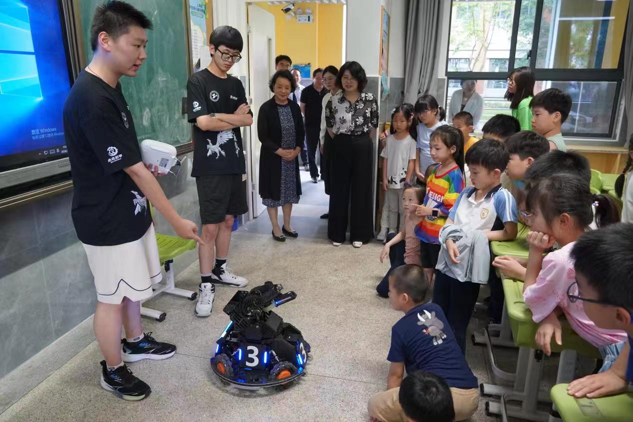 区校领导在走访中了解志愿者的工作日常,现场观摩了今年学校结合学科背景和专业特色,为爱心暑托班打造的符合小学生兴趣爱好和身心发展的两门特色课程:《盘扣技艺》和《全向轮步兵讲解课》,分别由纺织服装学院的缅甸籍留学生苏东山和机械与汽车工程学院的崔立梵同学授课。