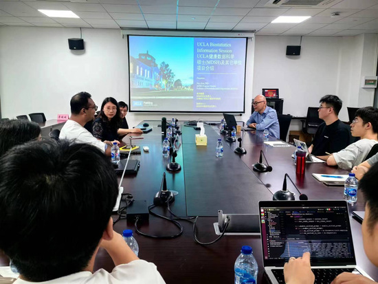 周华教授从项目宗旨、项目要求、申请条件、学位信息、课程设置、申请流程、相关费用及奖学金政策等方面详细介绍了MDSH项目,欢迎同学们前往UCLA深造。周华教授以“Statistical Methods and Computational Algorithms for Analyzing Biobank Data”为题,介绍了其团队近期在开发可伸缩的统计方法和计算算法方面的成果。报告结束后,在座师生与周华老师作了进一步交流。