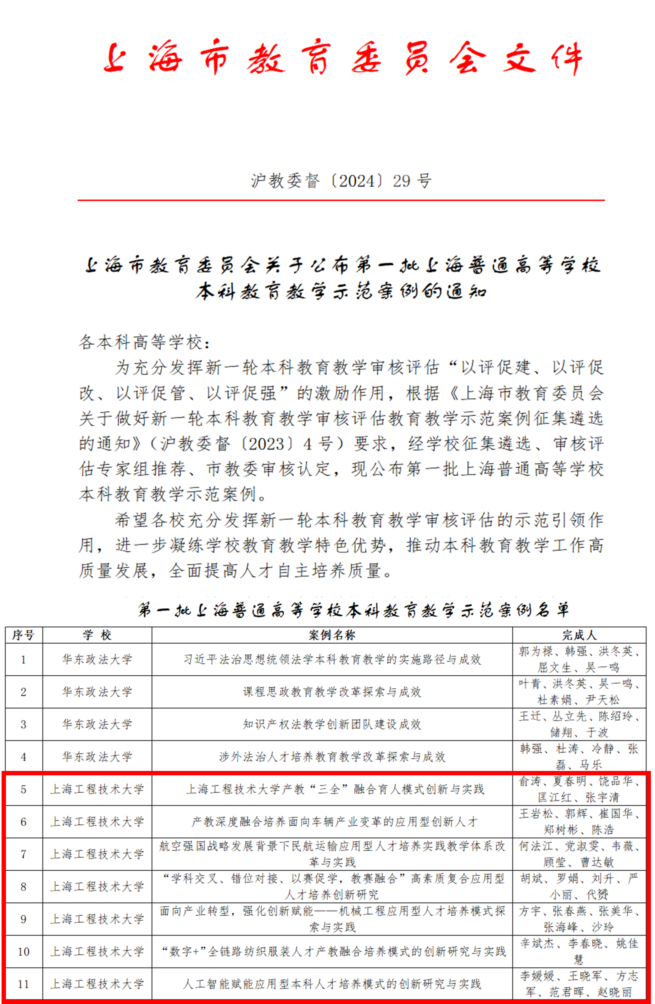 近日,上海市教育委员会公布了第一批上海普通高等学校本科教育教学示范案例名单。本次共遴选出32个示范案例,我校7个案例成功入选,入选案例数位居第一,充分彰显了学校在本科教育教学上取得的卓越成效。