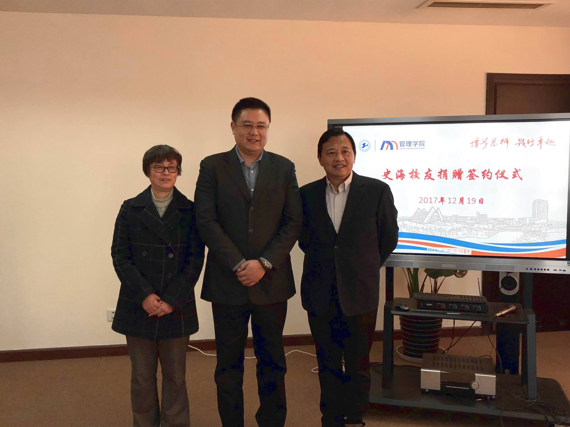 12月19日下午,管理学院在行政楼712举行了史海校友捐赠签约仪式。校党委副书记、副校长、管理学院院长史健勇,院党委书记周洁,校友会副主任周家樑,院党委副书记范君晖出席了签约仪式。