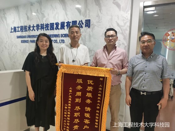 8月26日下午,上海广梵建筑装饰设计工程有限公司总经理陆钦为科技园送上“服务周到、尽职尽责、优质服务、情暖客户”锦旗,并对园区的服务表示感谢。科技园董事长袁蓉,总经理杨立东,管理服务部总监张健热情接待了企业一行。
