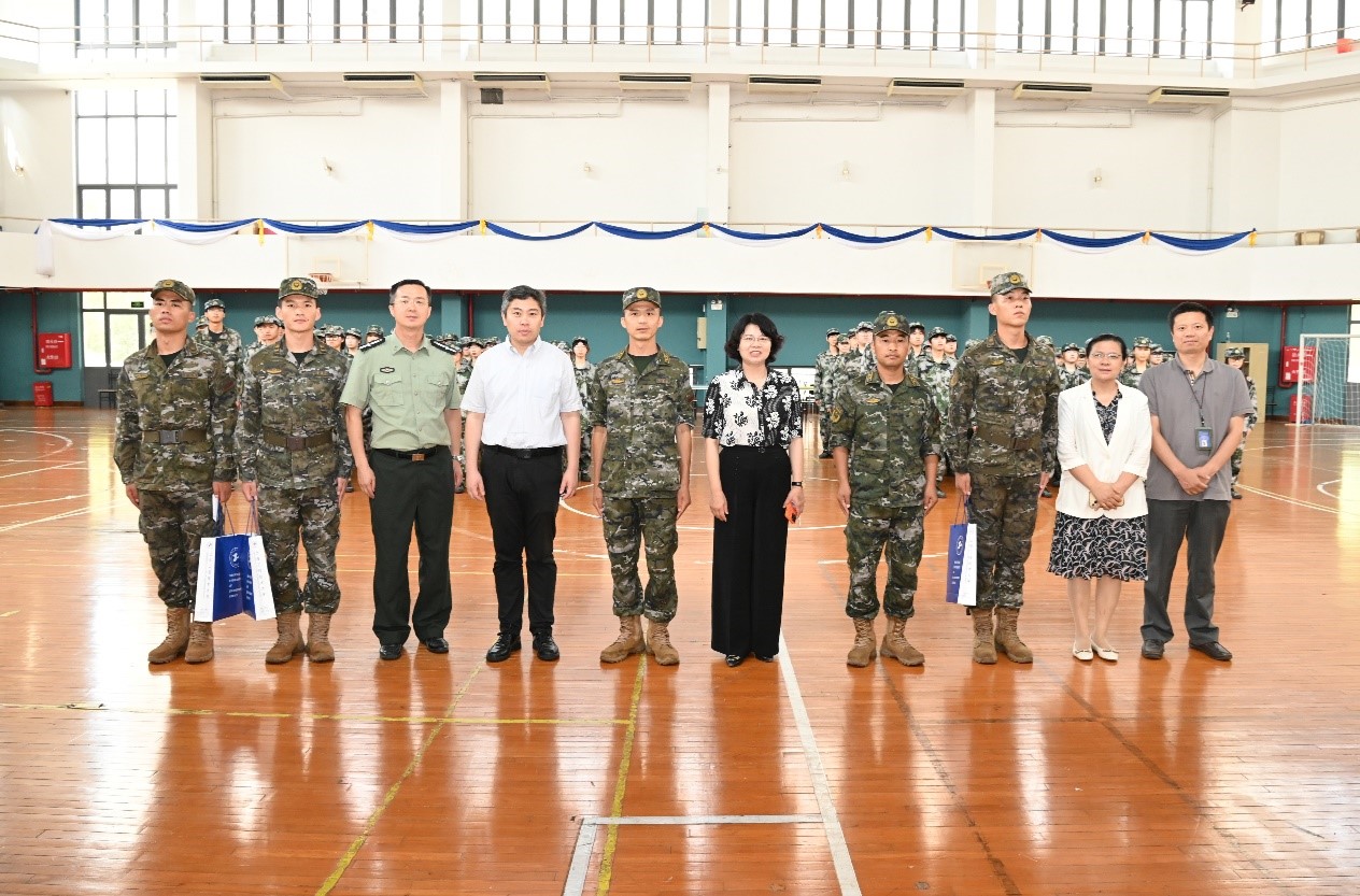 8月28日下午,校党委副书记、副校长朱晓青,武警某部刘振兴中校、任启超中校,学生工作部(处)、研究生工作部、武装部部长吕宁在长宁校区综合馆对2024年军训承训教官和参训学生进行慰问指导,艺术设计学院党委书记李云先、国际创意设计学院院长顾艺等陪同慰问。