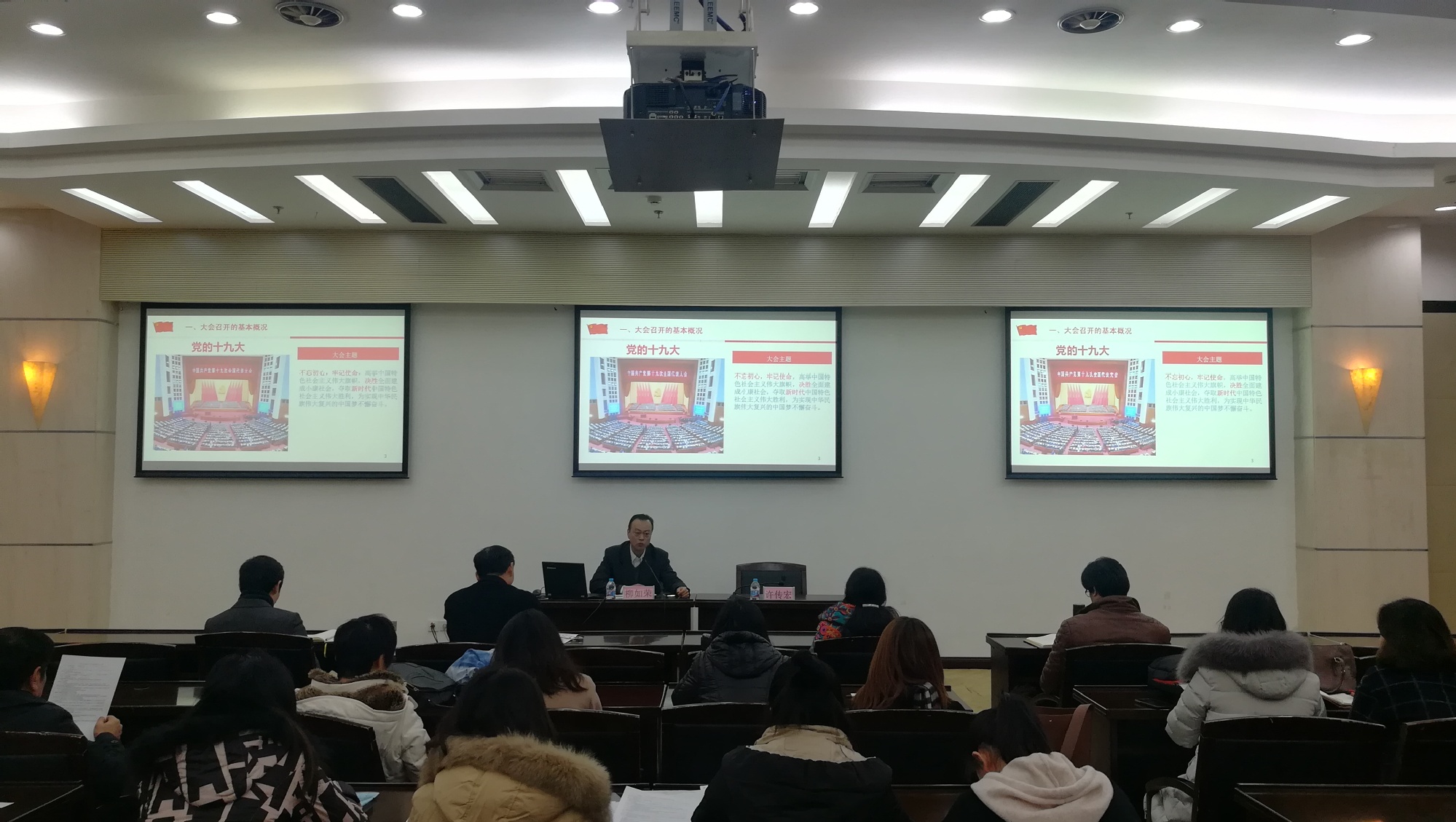 柳如荣老师从大会召开的基本概况、十九大报告的基本框架结构、十九大报告的核心内涵与要义、十九大对党章进行的重要修改、深入学习宣传贯彻落实十九大精神这五个部分对十九大进行了详细的辅导解读。他以不忘初心、牢记使命为开篇,阐述了十九大为实现中华民族伟大复兴的中国梦不懈奋斗的主题。其次,他介绍了十九大的重要议程,即7天5大议程,着重介绍了本次十九大回忆的政治成果、理论成果以及实践成果等重要成果。并且,讲述了十九大报告的核心内涵与基本要义,阐明我国社会主要矛盾发生转化,变为了:人民对美好生活的需要与不平衡不充分发展之间的矛盾等等。最后,柳如荣老师告诉在座的教工,广大师生在学习过程中要联系本部门、本职工作、本人思想实际, 牢牢把握现代化工程应用型大学的目标定位。在座教师党员代表认真听讲,并自己做好了笔记。