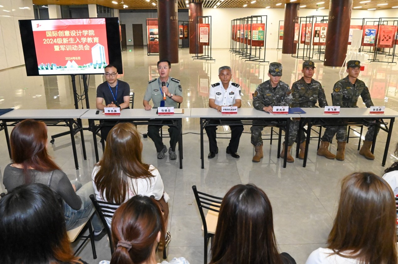 8月30日晚上,国际创意设计学院在长宁校区产教融合大楼举办2024级新生入学教育暨军训动员大会。艺术设计学院党委副书记马建立、上海市公安局沪西高校派出所高级警官陶忠、军训师独立营教官谢光华、新生辅导员李志海出席活动,活动由马建立主持。