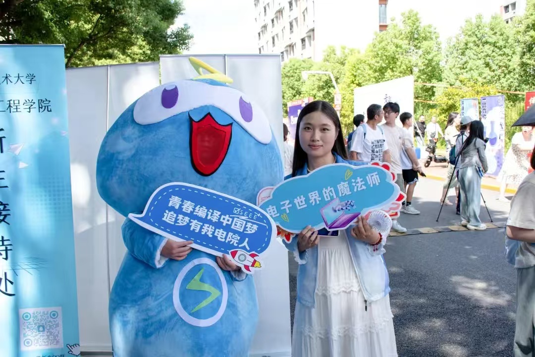 为了让新生更好地了解电院文化特色,学院在迎新点上融合了诸多电气学院的元素。全场最活泼的吉祥物“小电”是新生们拍照合影的首宠。