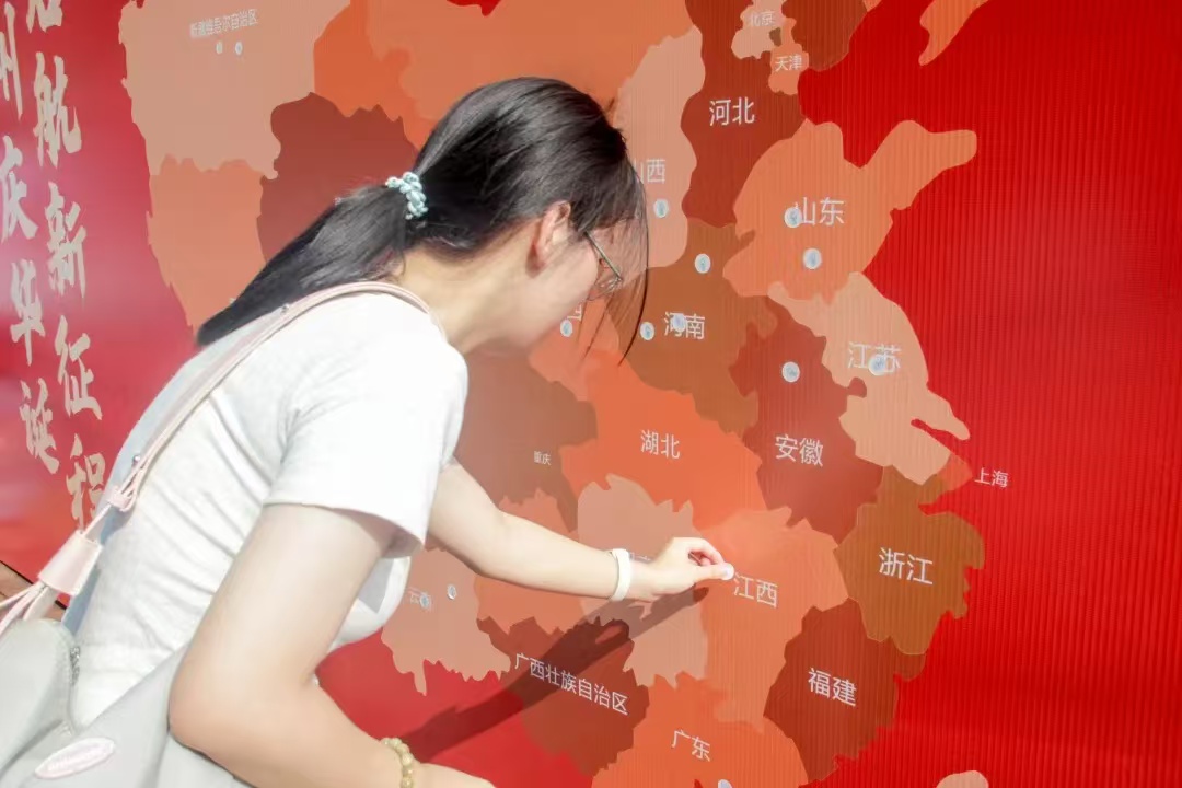“神州庆华诞 启航新征程”,24级的萌新在电院展板的中国地图上张贴自己的家乡地,留下属于自己的开学印记。