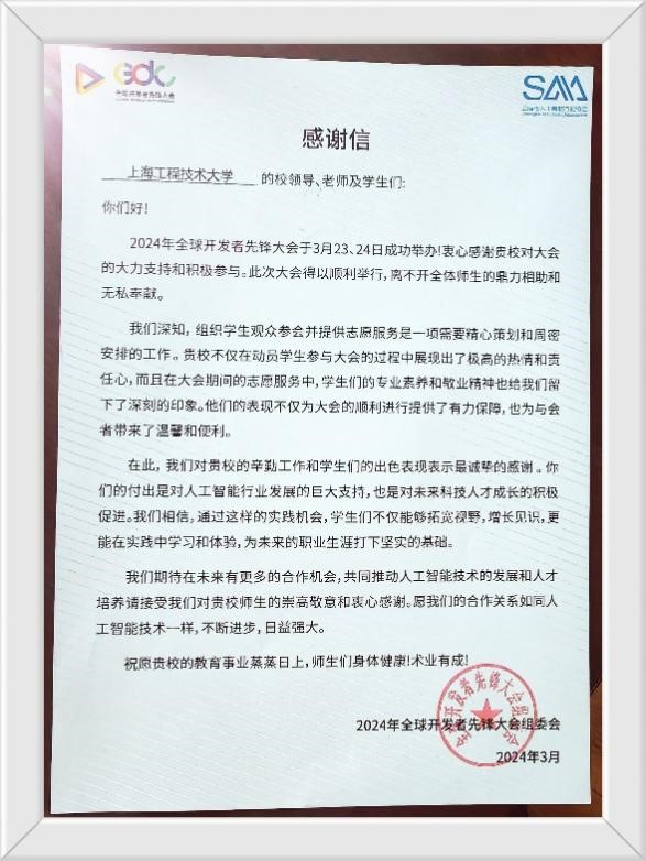 组委会对与学校未来的合作充满期待,希望能在更多项目中继续与学校保持密切合作,共同推动人工智能行业的发展。此次感谢信的获得,不仅是对学院在此次大会中表现的高度认可,也为学院的学子们树立了良好的榜样。学院将继续秉持培养高素质专业人才的使命,为社会输送更多具有国际视野与专业技术的优秀毕业生。