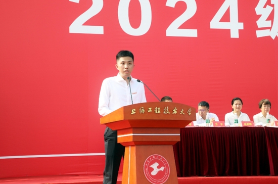 机械与汽车工程学院研究生会主席周宇轩作为老生代表发言。他分享了在上工程收获的博学、博志和博爱感悟,希望同学们努力跑出上工程人的“加速度”。