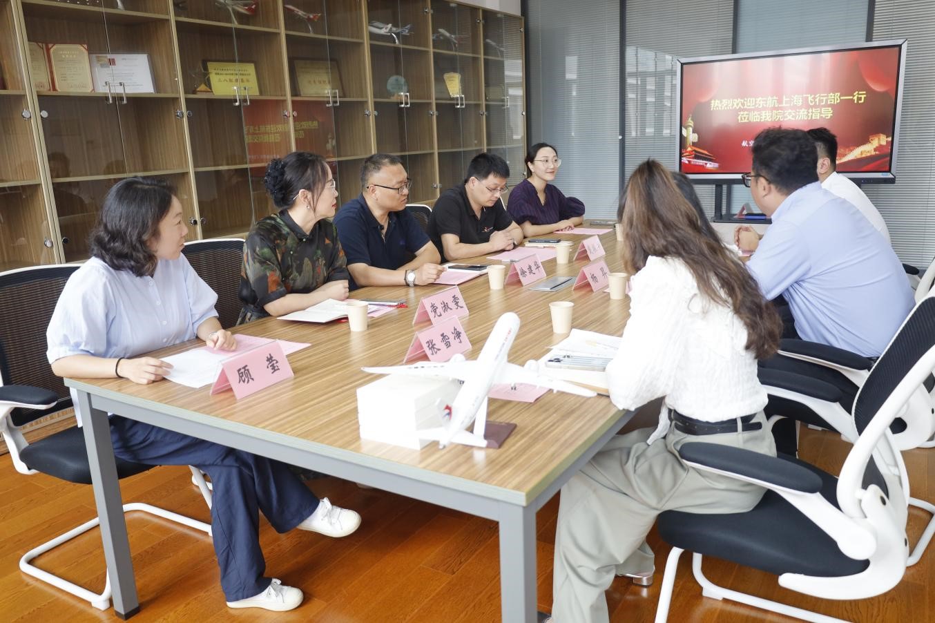 在校企见面会上,徐建华致欢迎辞,介绍了学院的整体情况。东航上海飞行部一行介绍了公司整体情况,表达了长期合作意愿,介绍了学生入职后的训练流程,向学院赠送C919飞机模型。飞行技术系主任顾莹和学生第四党支部书记陈丹凝分别介绍了相关工作的特色亮点。