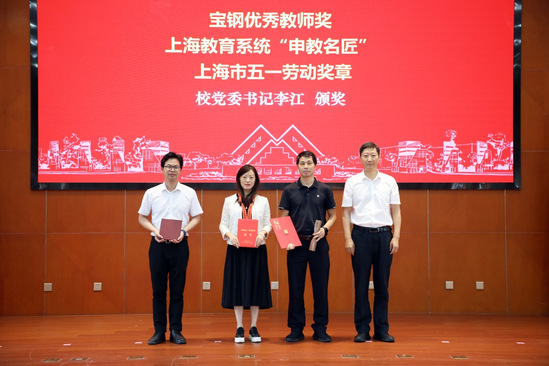 李江书记为荣获2023年宝钢优秀教师奖、2024年上海教育系统“申教名匠”、上海市五一劳动奖章的教师颁奖。