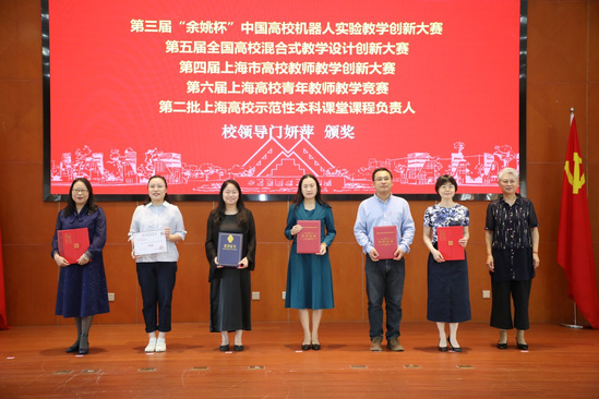 校领导门妍萍为各类教学竞赛获奖教师及上海高校示范性本科课堂课程负责人代表颁奖。