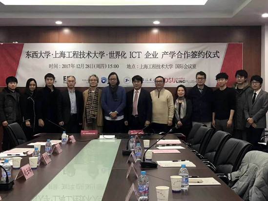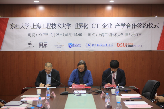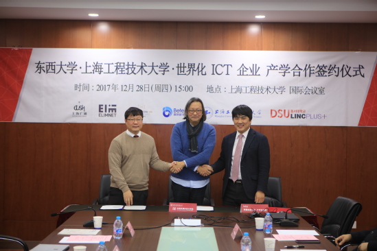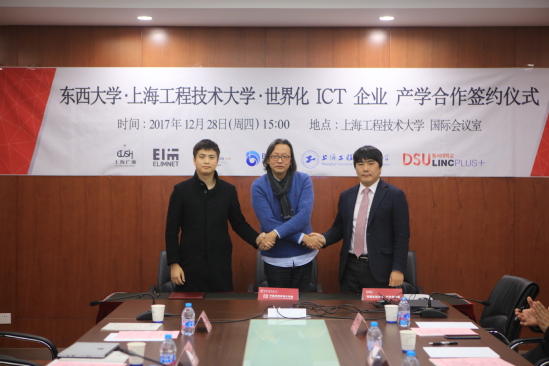 12月28日下午,中韩多媒体设计学院在我校仙霞校区教学楼103会议室举行学院、企业、协力团三方产学合作签约仪式。中韩多媒体设计学院吴亚生院长、金锺琪教授携专业教师与韩国东西大学产学协力团团长曺大洙、副团长金亨尤, 上海广涌文化艺术发展有限公司董事长赵云峰, 总经理金力, 上海爱琳信息科技有限公司总经理NA KYOUNG JOO, 上海赢赞数字科技有限公司总经理孙炜恒, 上海进画论信息科技有限公司总经理林宇丰等参加了本次会谈。