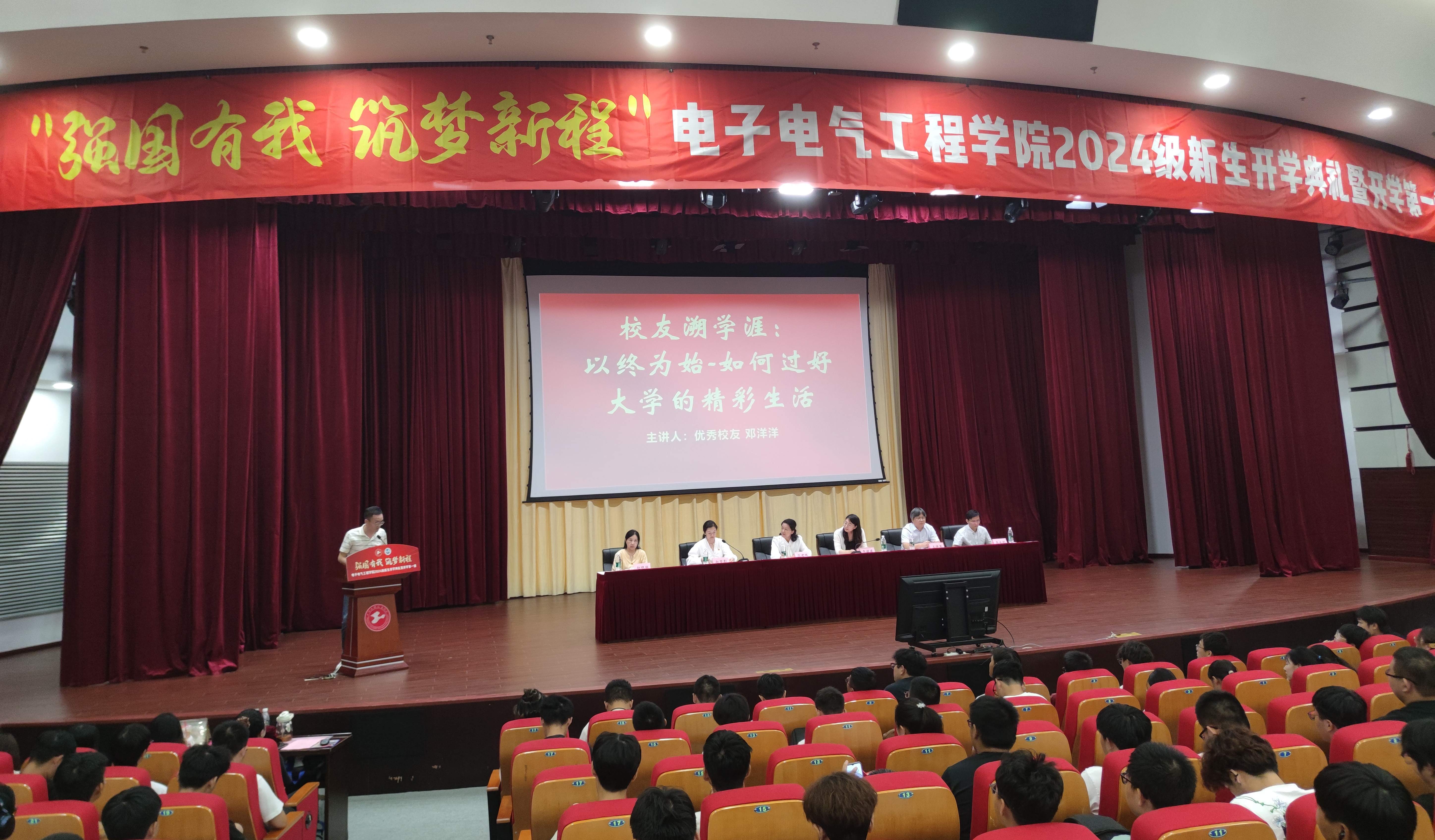 微风轻拂,彩旗飘扬。9月13日晚,电子电气工程学院2024级新生开学典礼暨开学第一课在志宏堂举行。学院党委书记范君晖,学院党委副书记、院长李媛媛,副院长王晓军、赵晓丽、高永彬,班导师代表,校友代表,导生代表,全体辅导员老师和2024级全体新生共同出席,典礼由学院党委副书记赵梦影主持。