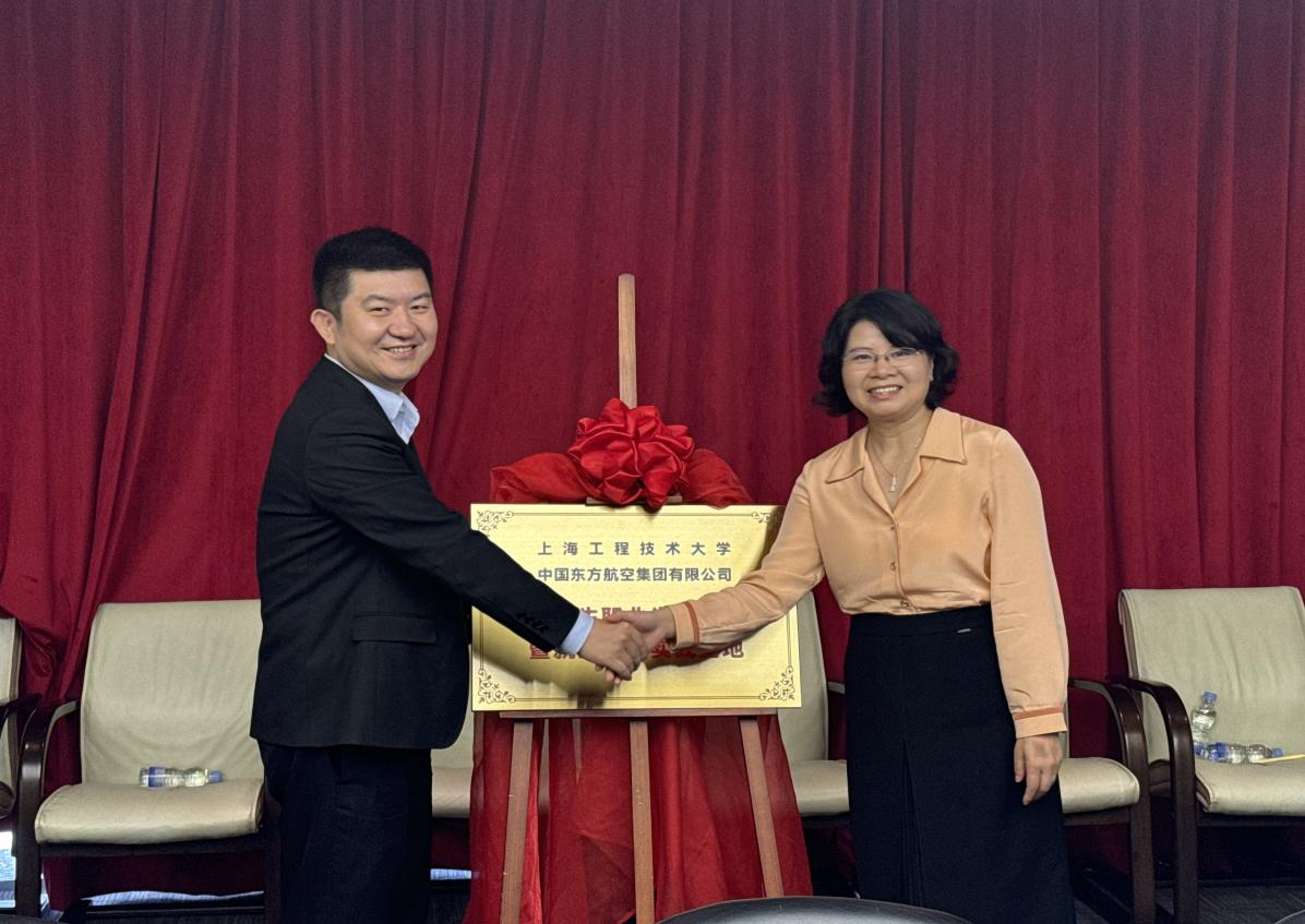朱晓青与东航人力资源部总经理邵啸晔共同为上海工程技术大学-东航大学生职业生涯教育暨就业创业实践基地揭牌。