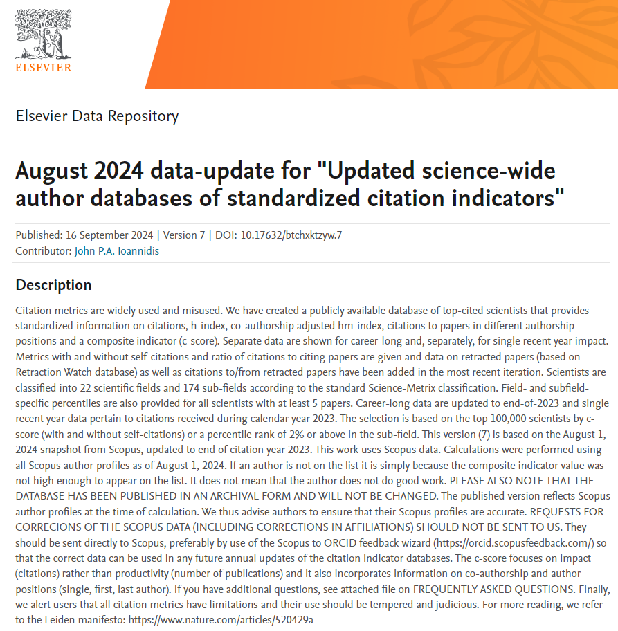 美国斯坦福大学的John Ioannidis教授团队新近在爱思维尔(Elsevier)出版集团官网上发布了2024年全球各学科前2%科学家榜单(第七版),通过统计每个科学家发表的论文数及其引用次数,采用6种指标建模进行综合评分,遴选出217098名科学家,大致涵盖了各学科排名前2%的科学家。中国大陆有10687名科学家入选,占4.92%。我校共有16位学者入选年度榜单,8位学者入选终身榜单。