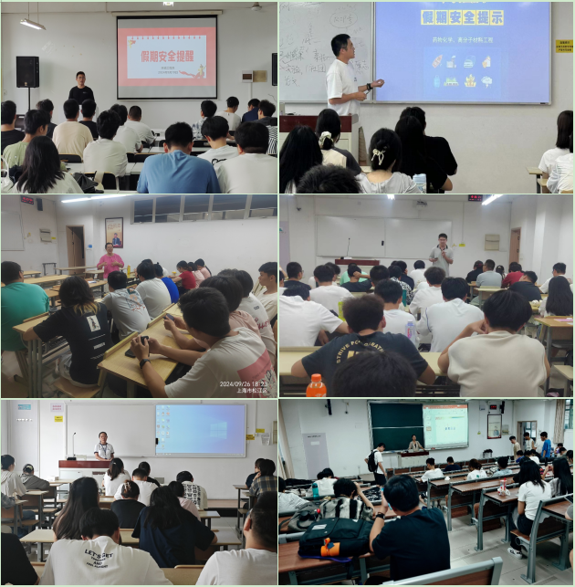 国庆假期在即,为做好学生安全教育管理工作,引导学生树立安全防范意识,确保学生能够度过一个安全、愉快的假期,9月26日至27日,化学化工学院各系、班级分别开展了国庆假期安全教育。
