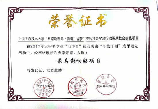 在中国青年报社、人民网共同主办的2017年全国大中专学生“三下乡”社会实践“千校千项”成果遴选活动中,管理学院“重行古丝绸路,聚焦重镇敦煌,探寻发展方略”暑期社会实践团队经网络展示及专家评审,获评“丝路新世界·青春中国梦”专项社会实践暑期社会实践项目“最具影响好项目”。