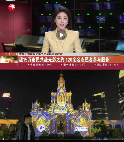 9月27日,位于静安区主会场的首届上海国际光影节顺利收官。我校艺术设计学院信息与媒体设计系主任朱炜老师携研究生徐浩文及多名本科生,积极参与了本次光影节的建筑立面投影项目(3d-mapping)。他们的作品《梦境》成功入选,并在上海展览中心主楼进行了现场展播,深受市民喜爱。
