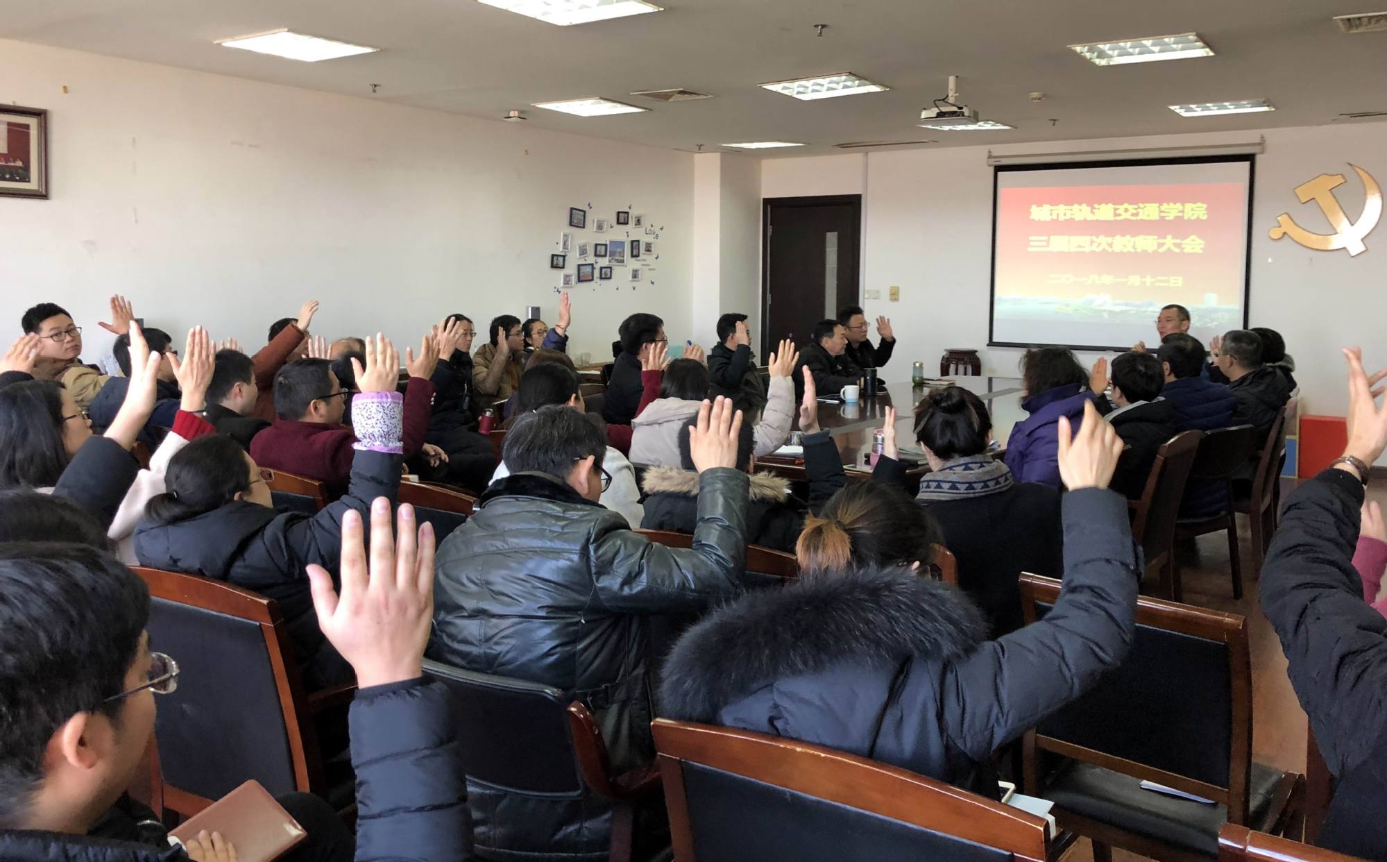 城市轨道交通学院三届四次教师大会在全体教师的充分肯定中结束。此次大会是一次促进学院管理科学化、民主化的大会,广大教职工都表示,将继续发扬了主人翁精神,进一步加强学院的民主管理,贯彻教育方针,实施素质教育,全面提高教育教学质量。