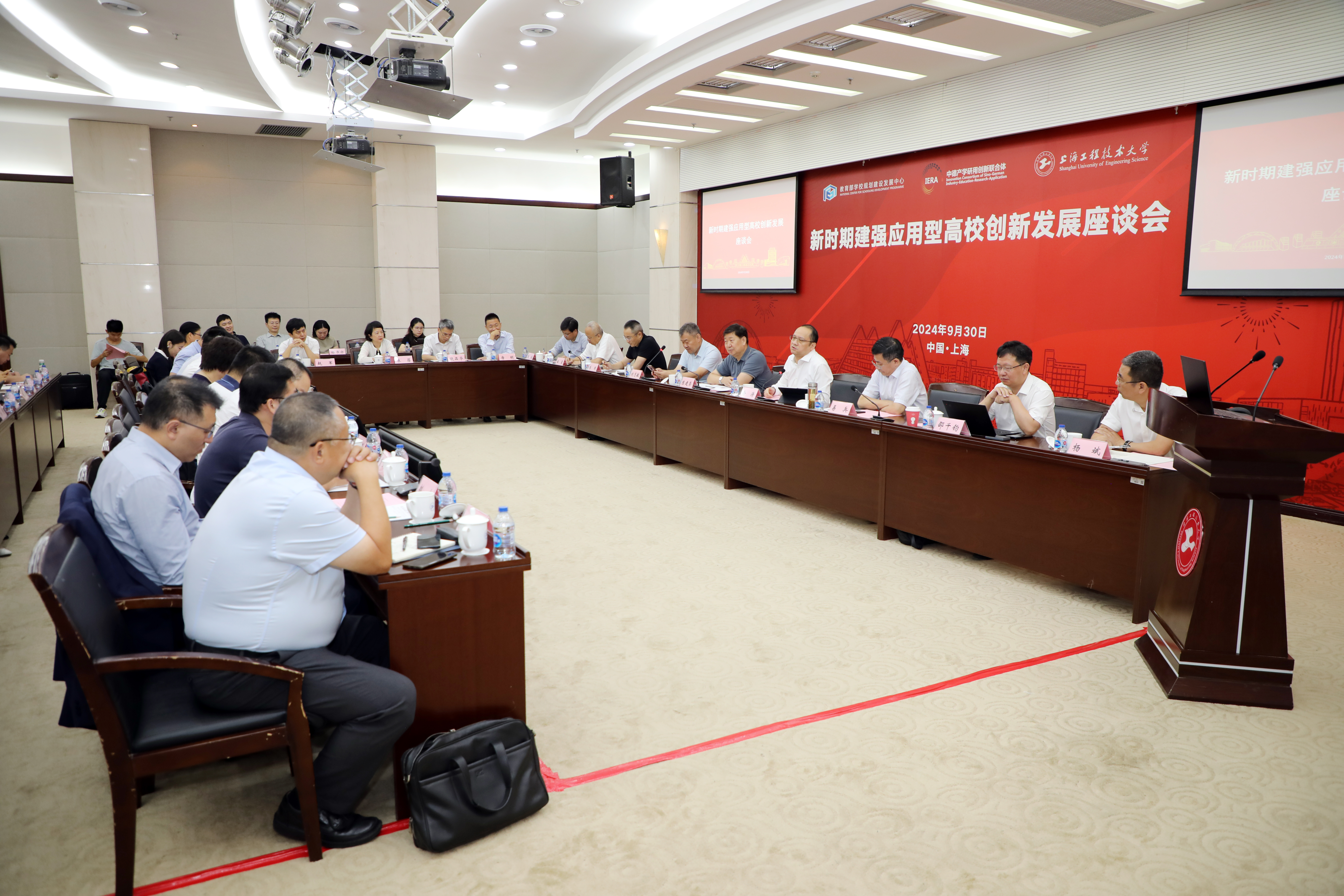 为深入学习贯彻落实全国教育大会精神,进一步凝聚思想共识、强化使命担当,深化产教融合和校企合作,加强我校中德产教融合发展研究院和中德产学研用创新联合体建设,9月30日,由教育部学校规划建设发展中心主办,我校承办的新时期建强应用型高校创新发展座谈会在图文信息中心第三报告厅举行。教育部学校规划建设发展中心副主任陈建荣、创新发展处处长刘志敏、首席专家牟延林,上海工程技术大学党委副书记、校长俞涛,成都大学、湖南工程学院等全国13所高校的校长、副校长以及职能部门负责人,华为技术有限公司、西门子(中国)有限公司等企业负责人出席会议。会议由教育部学校规划建设发展中心创新发展处处长刘志敏主持。