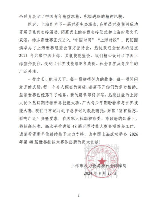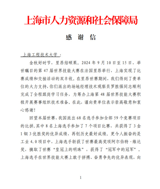近日,上海市人力资源和社会保障局向我校发来感谢信,感谢我校在第47届世界技能大赛举办期间,派出技术观察员观摩学习世界技能大赛,为上海即将于2026年举办的第48届世界技能大赛做好赛事组织准备。