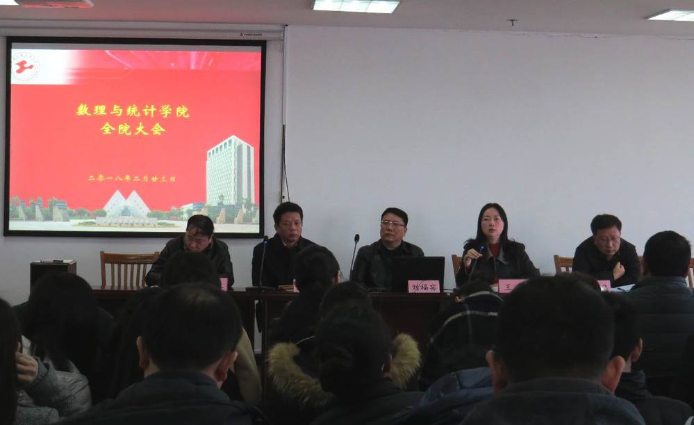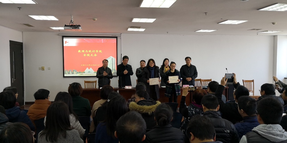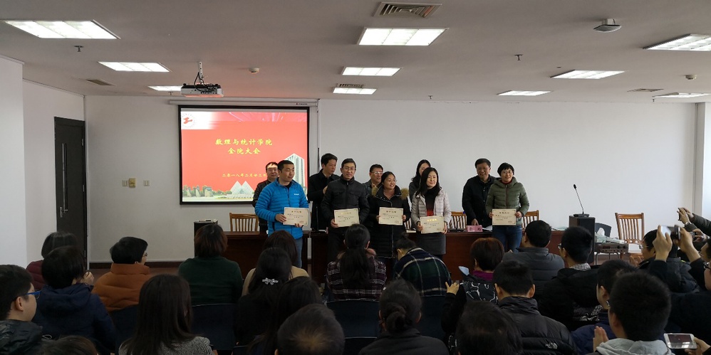 刘福窑院长代表数理与统计学院领导班子做了2017年重点工作回顾,对2018年的重点工作做了部署。总结过去一年在教学科研上取得的成绩,对获得荣誉的教师颁发了证书。在新一年工作部署中,学院将紧密围绕学校“人才强校、特色发展、国际化”三大战略,进一步解放思想,深化改革,开拓创新。人才强校方面,学院响应学校号召引进高水平人才、加大现有教师培训力度。2017年学院由基础教学学院更名为数理与统计学院,学院的目标从基础教学型学院向专业学院转型,学院需始终如一,践行初心,继续履行使命,一方面在不断完成基础教学的任务,突出学院特色学科竞赛,守成再创新,另一方面开拓专业学院的建设,对应用统计学本科专业,研究生专业的建设制定规划,艰苦奋斗再创业。
