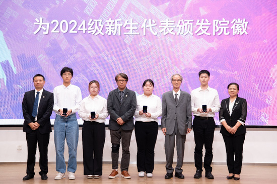 艺术设计学院党委书记李云先、国际创意设计学院院长顾艺为2024级新生代表颁发院徽。