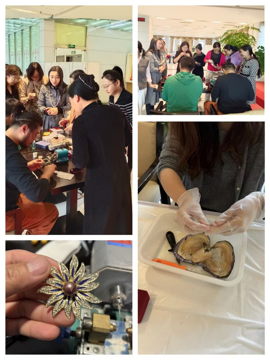 活动开始,专业老师为大家分发了珍珠蚌和制作工具,讲述了珍珠的基本知识以及珍珠饰品的制作步骤。随后,老师们迫不及待地用专业工具进行开蚌,整个过程犹如开“盲盒”一般,大小、颜色、形状不同的珍珠呈现眼前让人惊喜不已。接着,经过清洗、选珠、抛光、打孔、粘贴等一系列工序,一颗颗珍珠被镶嵌到不同的配饰上,变成了每个老师专属的胸针或项链饰品。