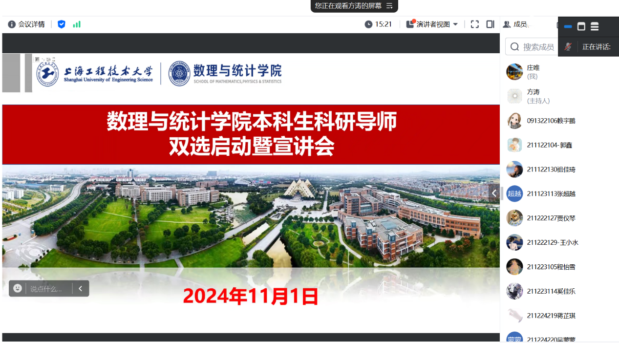 11月1日,数理与统计学院在线召开本科生科研导师双选启动暨宣讲会,面向学院大二、大三本科生,实现本科生与导师进行双向选择,确定带教指导关系。
