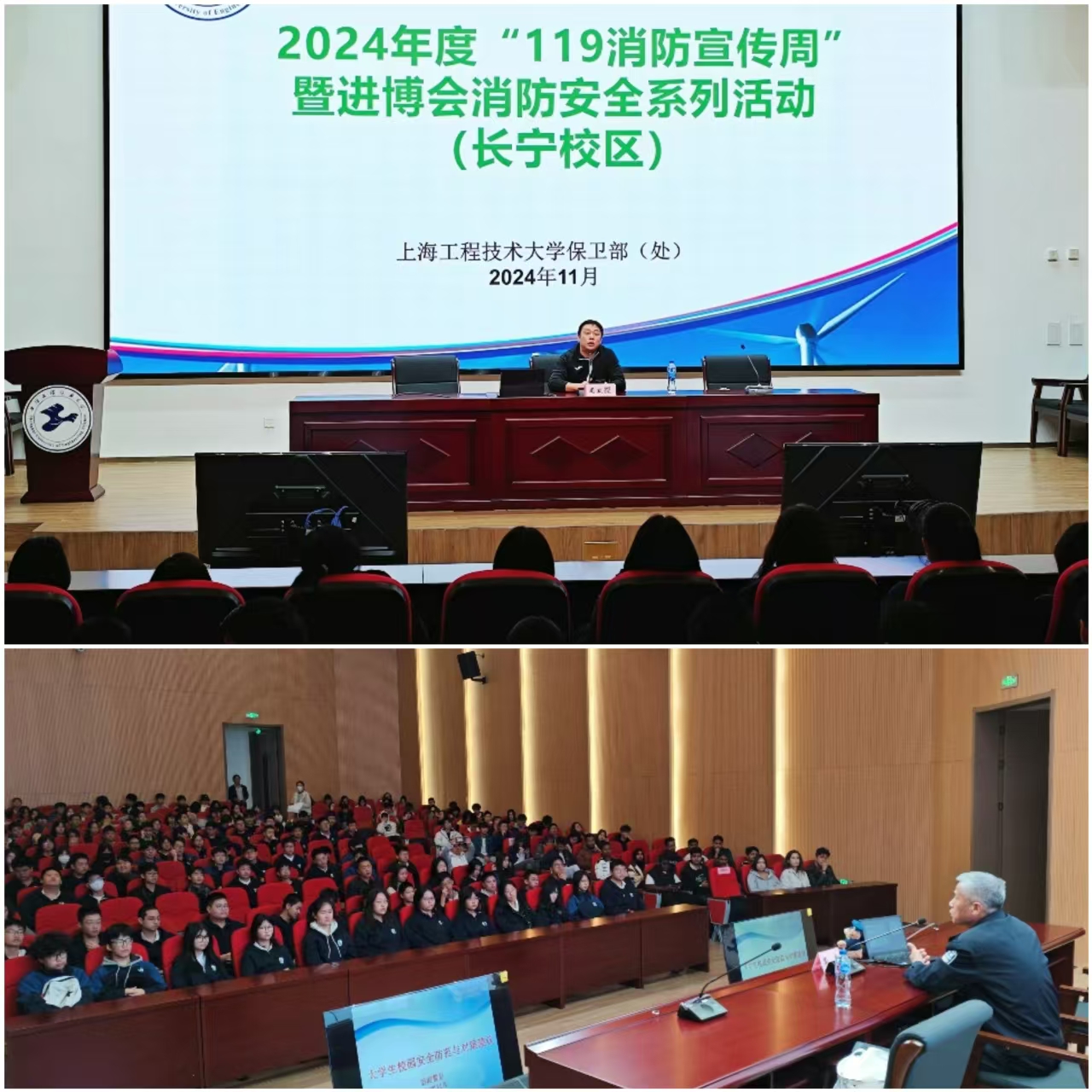 为了加强学校消防安全管理,结合冬季校园防火防控工作,11月7日下午,保卫部(处)在长宁校区组织开展了“119消防宣传周”活动。活动由消防安全知识讲座、灭火器实操演练、消防设施技能实操三个环节组成。保卫部(处)副部(处)长周家樑、师生代表、后勤保障人员及安保队员代表约300余人参加活动。