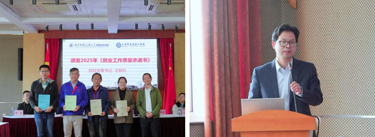 王振钧向三系负责人颁发了2025年就业工作质量承诺书。郑树彬在感谢就业工作者的同时,强调就业工作在招生工作、人才培养等整个内涵建设环节中的重要地位,从“思想要有站位、工作要有思路、人培要有内涵、合作要有资源”四个角度对就业工作提出期望。