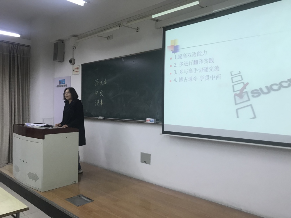 马德忠老师从四个方面进行了讲解,一是国内的主要的翻译赛事;二是比赛获奖作品的解析;三是翻译资格证书考试和“国才考试”;四是如何提高翻译水平。在谈到韩素音女士的时候,他穿插介绍了韩素音女士德艺双馨,对祖国始终怀着一颗滚烫的赤子之心,在国际舞台上热情讴歌新中国取得的伟大成就;在解析翻译佳作时,他指出翻译要考虑多个层面的因素,宏观到文化层面,微观到语素层面,鼓励同学们要博学多识,博古通今,要善于通过优秀译著和勤于实践来不断提高翻译基本功。周欣老师分享了自己参加韩素音翻译大赛的心得体会,介绍了杨绛先生先进行直译再做修改润色的翻译诀窍,告诫大家不要以辞害意,要始终以忠实于原文为准绳。