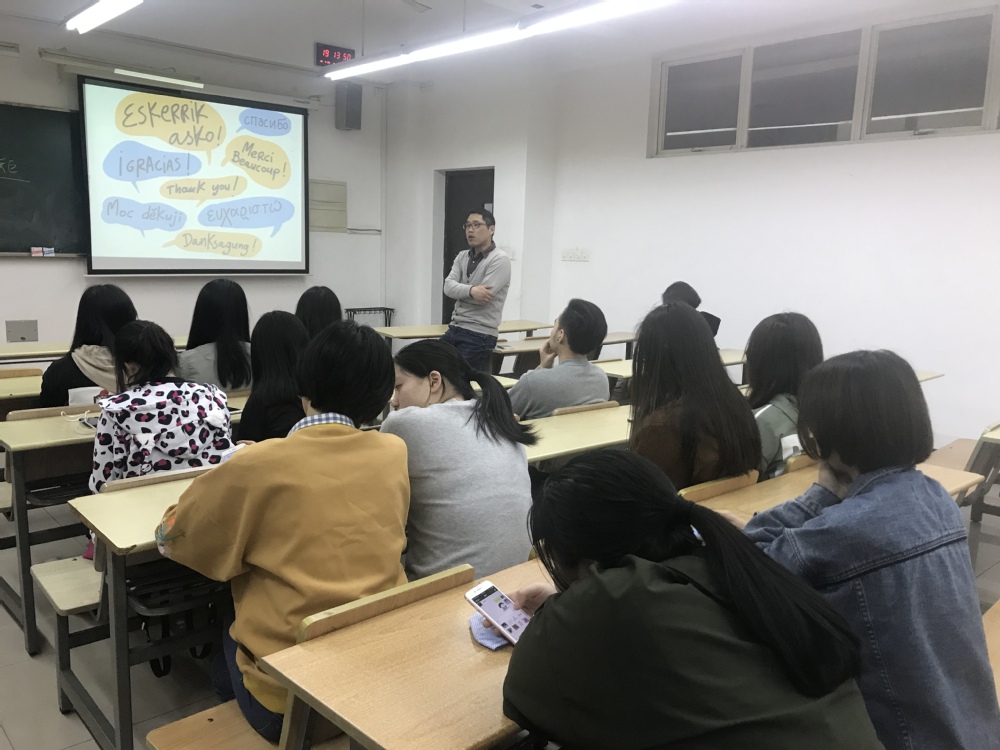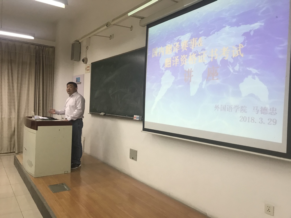 3月29日,外国语学院在教学楼B102教室为翻译专业的学生举办了专题讲座,介绍“韩素音国际翻译大赛”等翻译赛事以及两种翻译资格证书考试、“国才”考试,由马德忠老师和周欣老师主讲。讲座由外国语学院翻译系主任刘金龙副教授主持,翻译学博士王珏老师也与学生进行了精彩的互动。