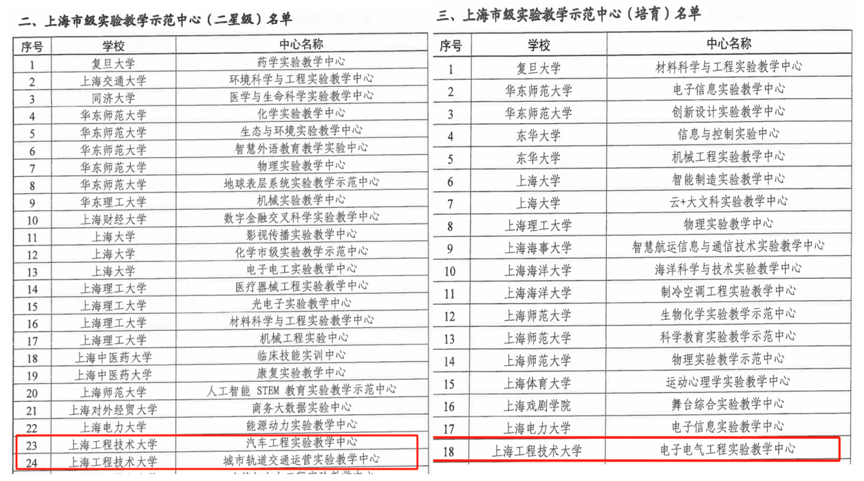 近日,上海市教委发布《上海市教育委员会关于公布2024年上海市级实验教学示范中心名单的通知》(沪教委高〔2024〕46号),我校共有3个中心获批市级实验教学示范中心,其中,汽车工程实验教学中心、城市轨道交通运营实验教学中心被评为二星级示范中心,电子电气工程实验教学中心被评为培育级示范中心。