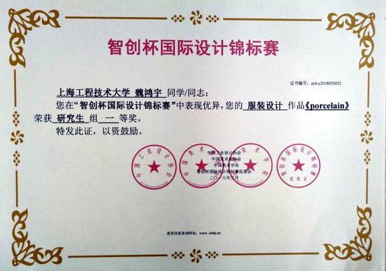 服装学院艺术与时尚设计专业研究生魏鸿宇的设计作品《porcelain》荣获“智创杯”国际设计锦标赛研究生组一等奖。
