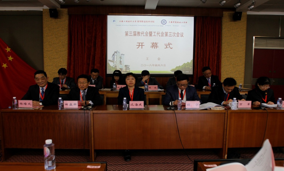 4月8日,上海工程技术大学高等职业技术学院、上海市高级技工学校第三届教代会暨工代会第三次会议在综合楼九楼报告厅召开。学院、校党委书记沈海庆,党委副书记、院、校长胡宁,党委副书记田盈耕、李云先,副院(校)长吴训成、郑卫、万军出席会议,党委副书记、工会主席田盈耕主持会议。44名正式代表参加开幕式,来自各职能部门、系部的有关负责人等列席会议。