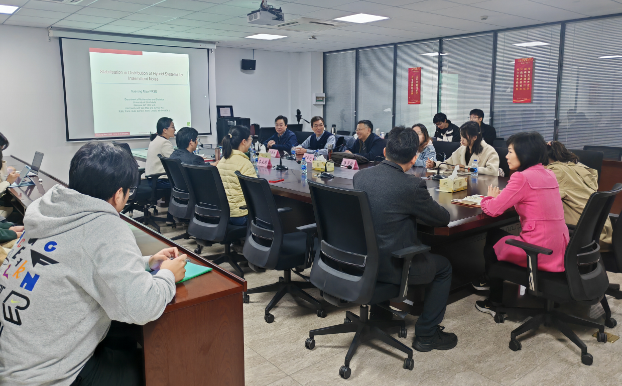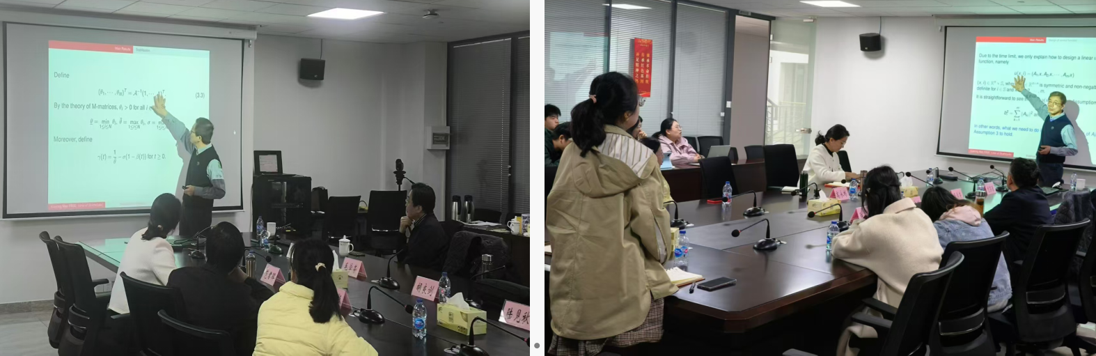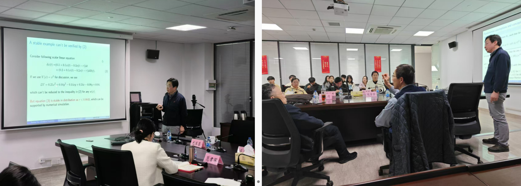 毛学荣教授是英国Strathclyde大学数学与统计系终身教授、爱丁堡皇家学会(即苏格兰皇家科学院)院士、国际知名的随机分析和随机控制领域专家,是现代随机稳定性领域的奠基人。讲座中,毛学荣教授深入浅出地讲解了随机系统依分布稳定这一特性的内在含义及其研究的必要性、随机噪声的镇定作用以及间歇控制的内在机理,详细讨论了运用间歇随机噪声依分布镇定混杂随机系统分析处理过程中的关键技术和技巧以及该理论在神经网络系统中的应用。